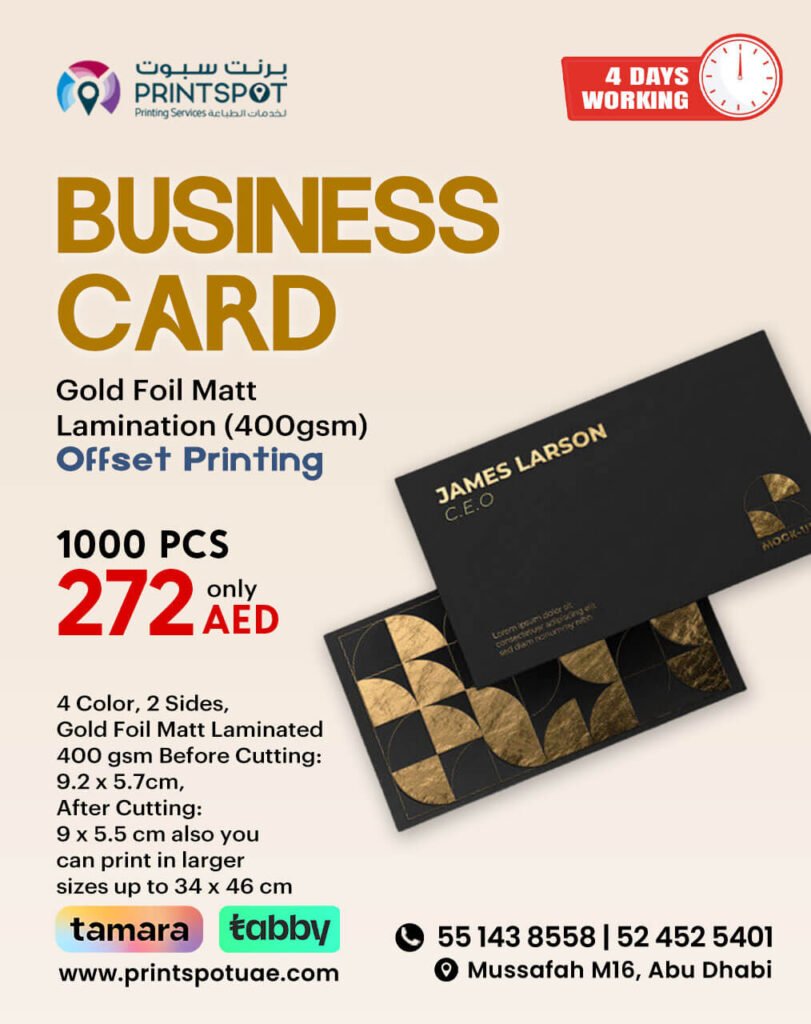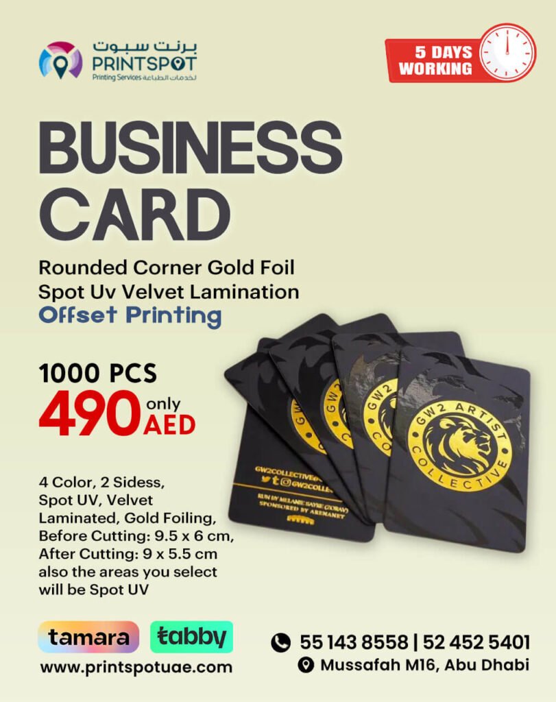 PrintSpot specializes in high-quality business card printing for entrepreneurs, startups, corporates, and organizations across the UAE. Whether you need elegant gold foil cards, matt laminated finishes, or digital prints – we deliver superior results that leave a lasting impression.