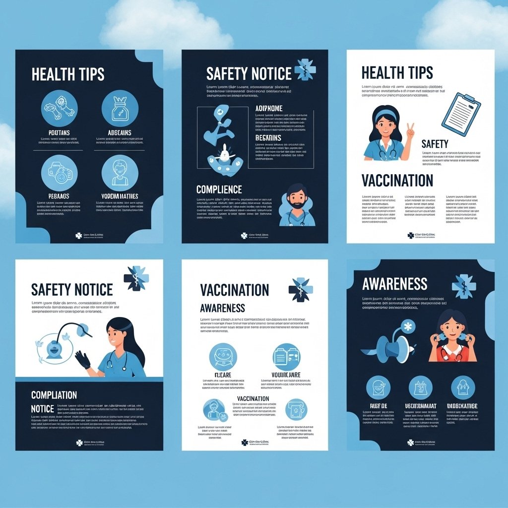 Health tips, safety notices, compliance posters, vaccination info, and awareness campaigns.