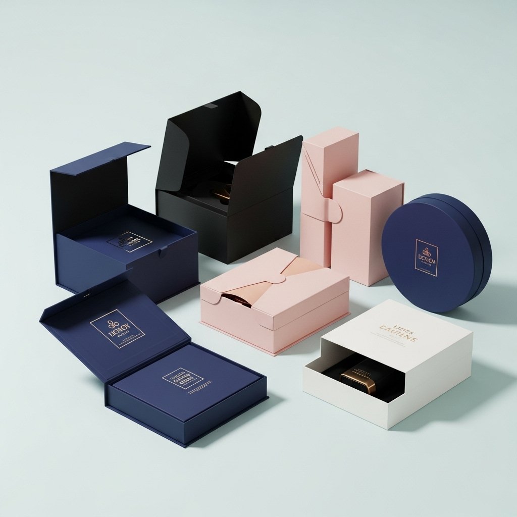 - Premium Materials – rigid boxes, foils, laminates, holographic & matte finishes.