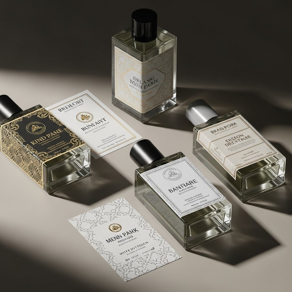 - Perfume bottle labels – front, back, and neck labels with precise printing and premium finishes
