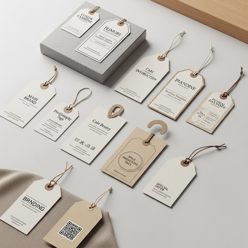 Brand tags, care instructions, and promotional hang tags for customer engagement.