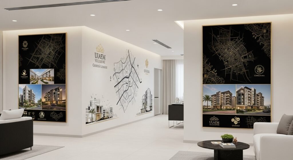 Custom-designed vinyl wall stickers for showrooms, offices, or property exhibitions — add branding, maps, or property visuals easily.